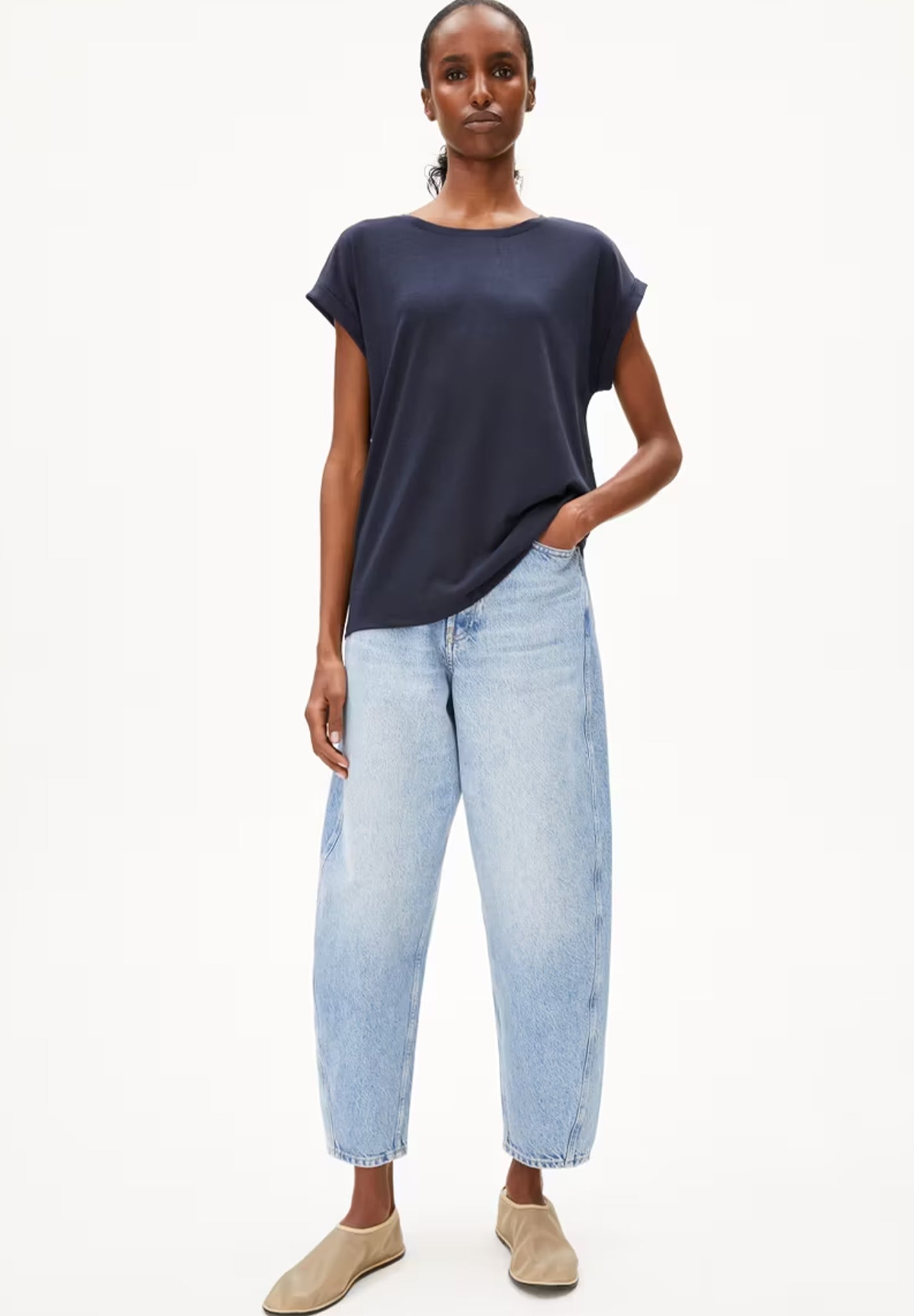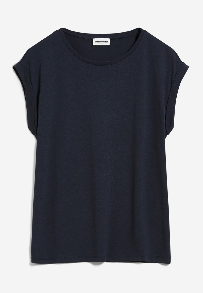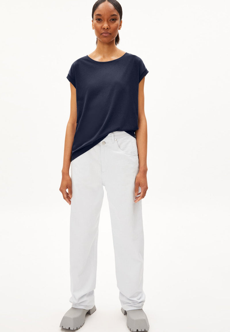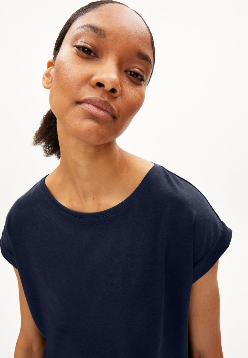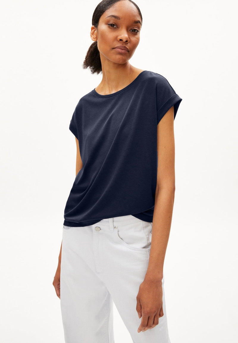 Das Jilaana T-Shirt von Armedangels vereint Schlichtheit und nachhaltige Materialien in einem vielseitigen Basic. Hergestellt aus 67 % Lyocell Tencel™ und 33 % Bio-Baumwolle, bietet es ein besonders weiches Tragegefühl und eine umweltbewusste Alternative zu herkömmlichen Materialien. Der Regular Fit sorgt für eine bequeme Passform, die ideal für den Alltag geeignet ist. Mit einem klassischen Rundhalsausschnitt und kurzen Ärmeln ist das T-Shirt ein zeitloser Begleiter, der sich mühelos kombinieren lässt. Das einfarbige Design verleiht ihm eine moderne und minimalistische Optik. Hergestellt in Portugal, steht das Jilaana T-Shirt für bewusste Mode mit Stil – perfekt für alle, die Nachhaltigkeit und Komfort schätzen.